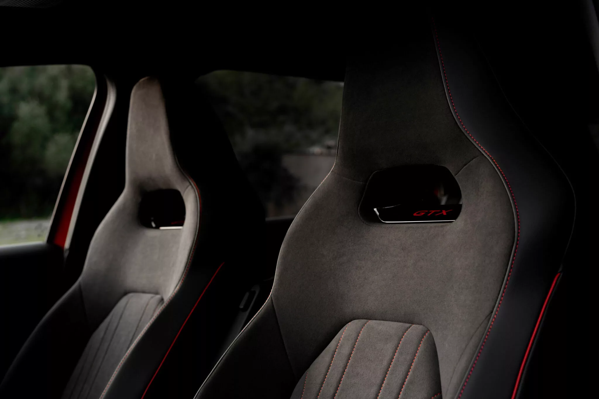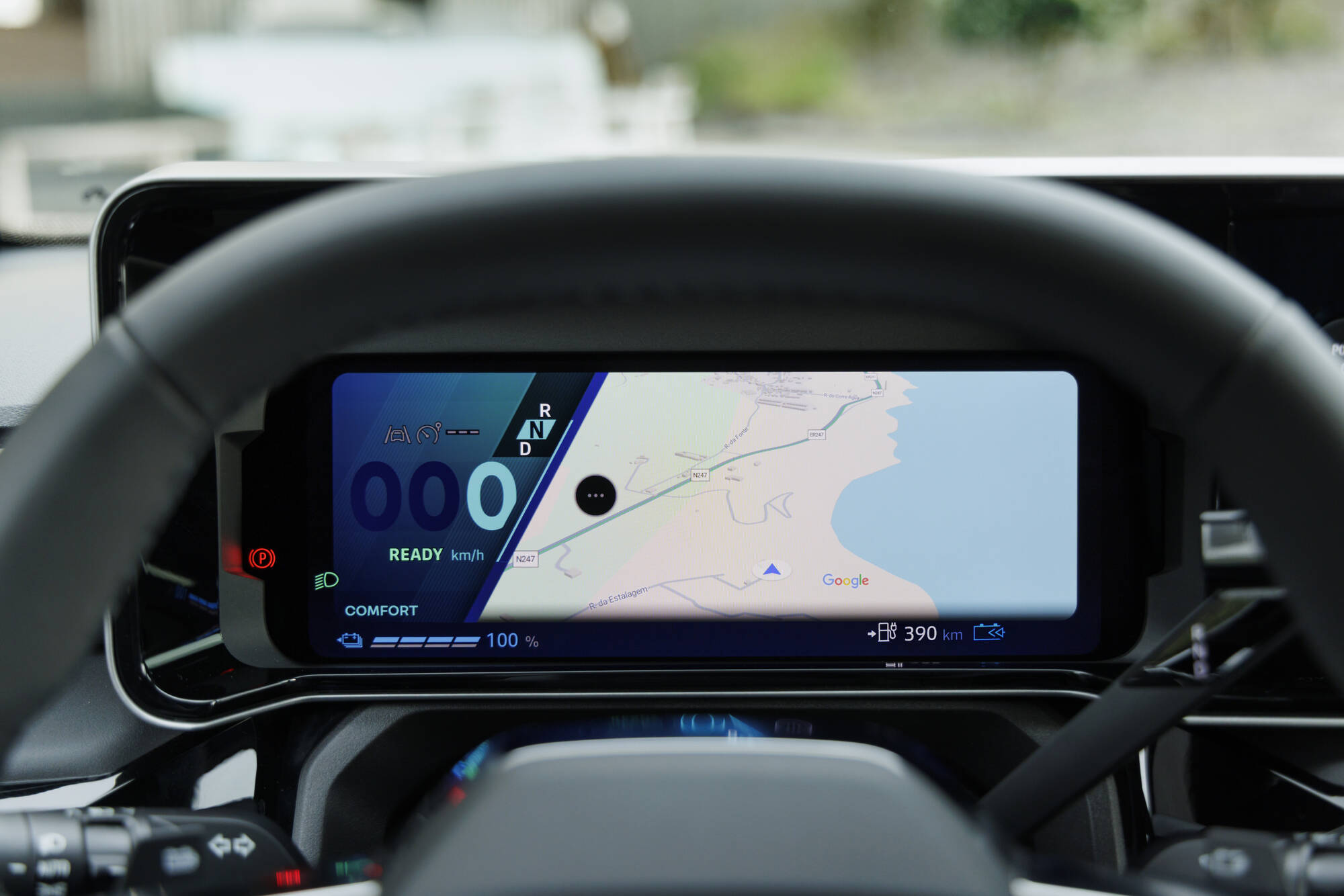 Destaque: Disponível também como SW (familiar) com mala de 548 L. Motor único (156 CV) oferece 413 km de autonomia. Interior i-Cockpit com volante compacto e materiais reciclados.