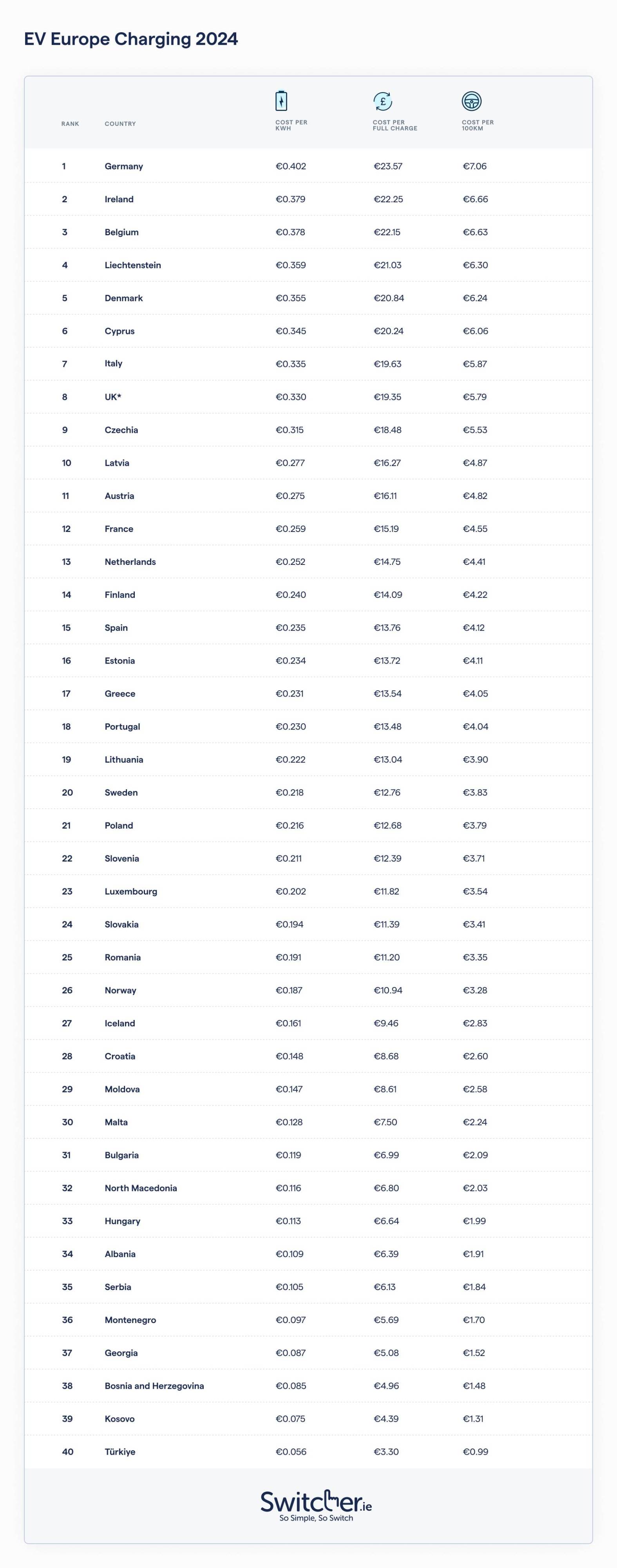 Alemanha pratica os preços mais altos, com valor médio de 23,57 euros para um carregamento completo em casa. Imediatamente atrás, a Irlanda, onde os carregamentos domésticos têm um custo médio de 22,25 euros. Sendo de 6,66 euros a fatura a pagar por 100 km de autonomia. Menos 0,40 euros do que na Alemanha..