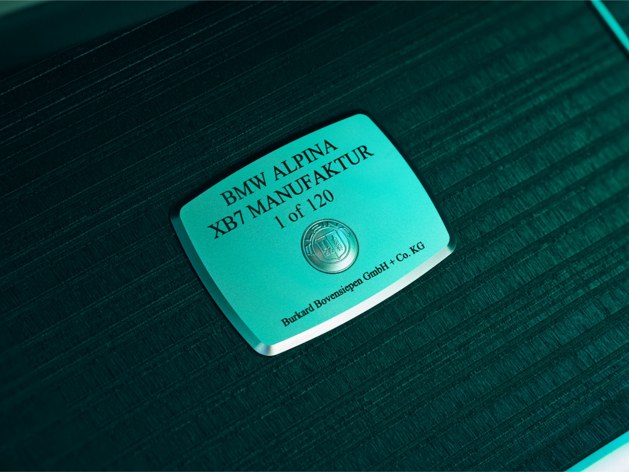 Independentemente da cor exterior, o habitáculo é revestido em couro Tartufo Full Merino, com acabamentos em Alpina Walnut Nature Black. Os encostos de cabeça dianteiros exibem o histórico bordado Alpina em verde e azul, enquanto uma placa metálica na consola central identifica cada unidade como “1 of 120”. O equipamento inclui bancos individuais na segunda fila, sistema de som Bowers & Wilkins Diamond e duas malas Alpina artesanais em couro Lavalina.