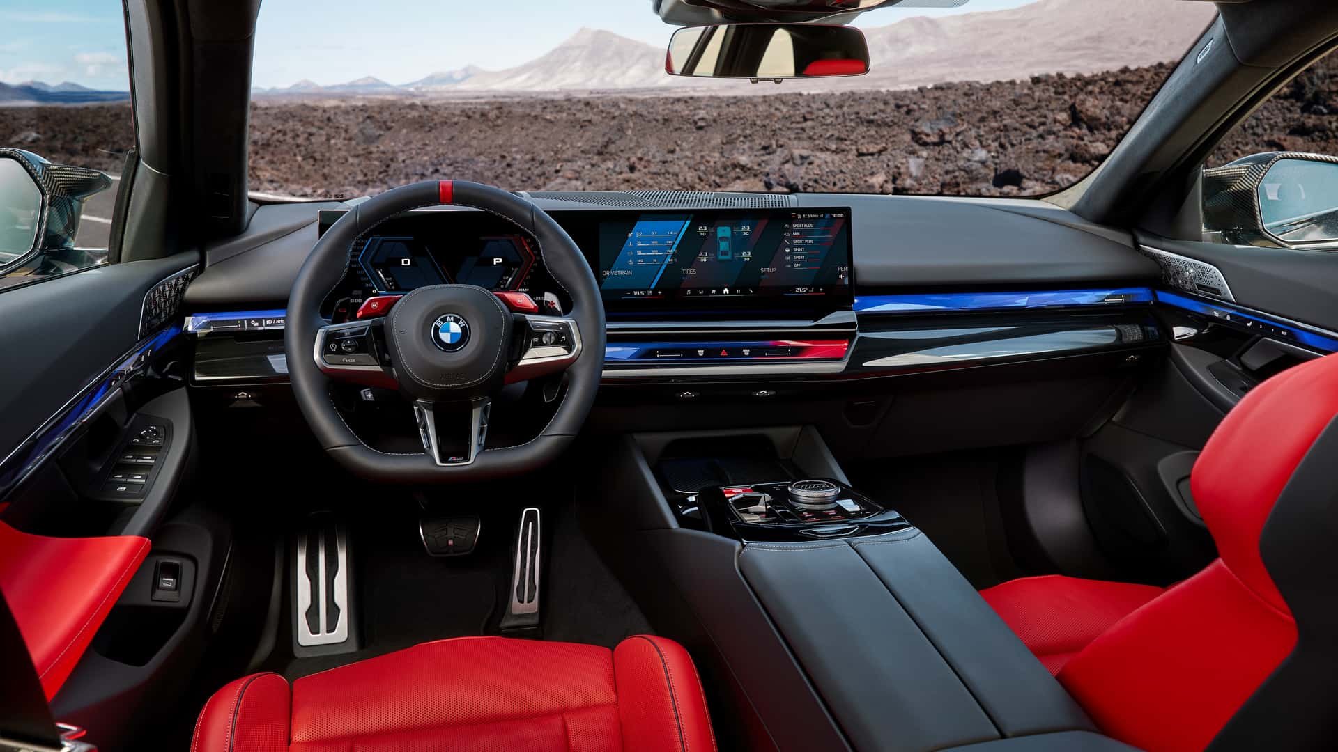 A M GmbH também aplanou a parte inferior dos seus volantes. Como sempre, o aro é muito espesso e apresenta naturalmente os botões M vermelhos, que podem ser utilizados para selecionar as definições pré-configuradas para os modos de condução. As patilhas de mudança de velocidades são pretas com detalhes vermelhos.