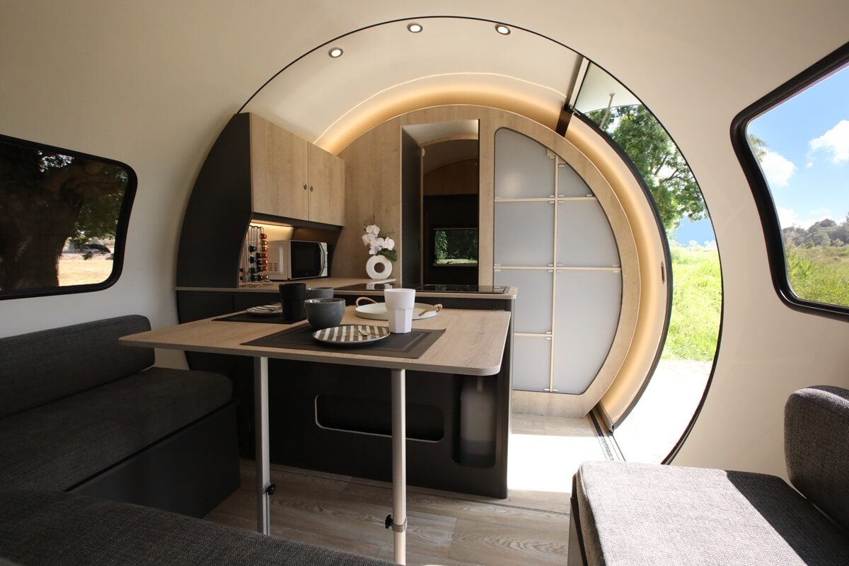 Em viagem, a caravana mede apenas 1.95 m de largura (ideal para garagens!), mas no campismo, com um simples toque de um botão, os módulos laterais deslizam como um acordeão, para triplicar a área útil, chegando aos 12 m², com sala, cozinha, quarto e casa de banho!