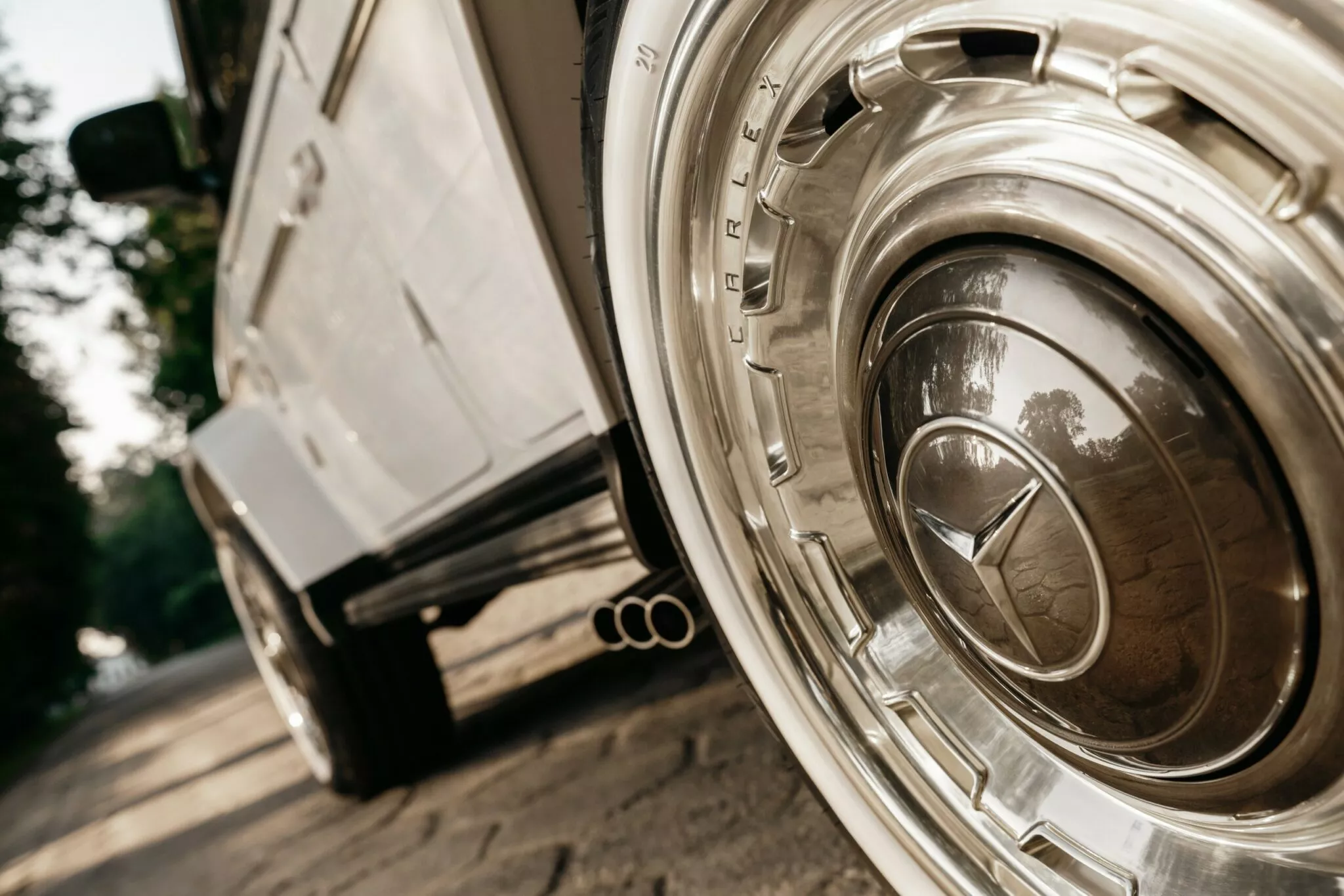 O elemento mais deslumbrante—e certamente o mais caro—deste G63 é a sua pintura. A Carlex não se contentou com uma simples tinta “pérola” ou cromada. A oficina polaca incorporou aproximadamente 1 kg (2,2 libras) de pó de diamante na formulação da pintura branca.