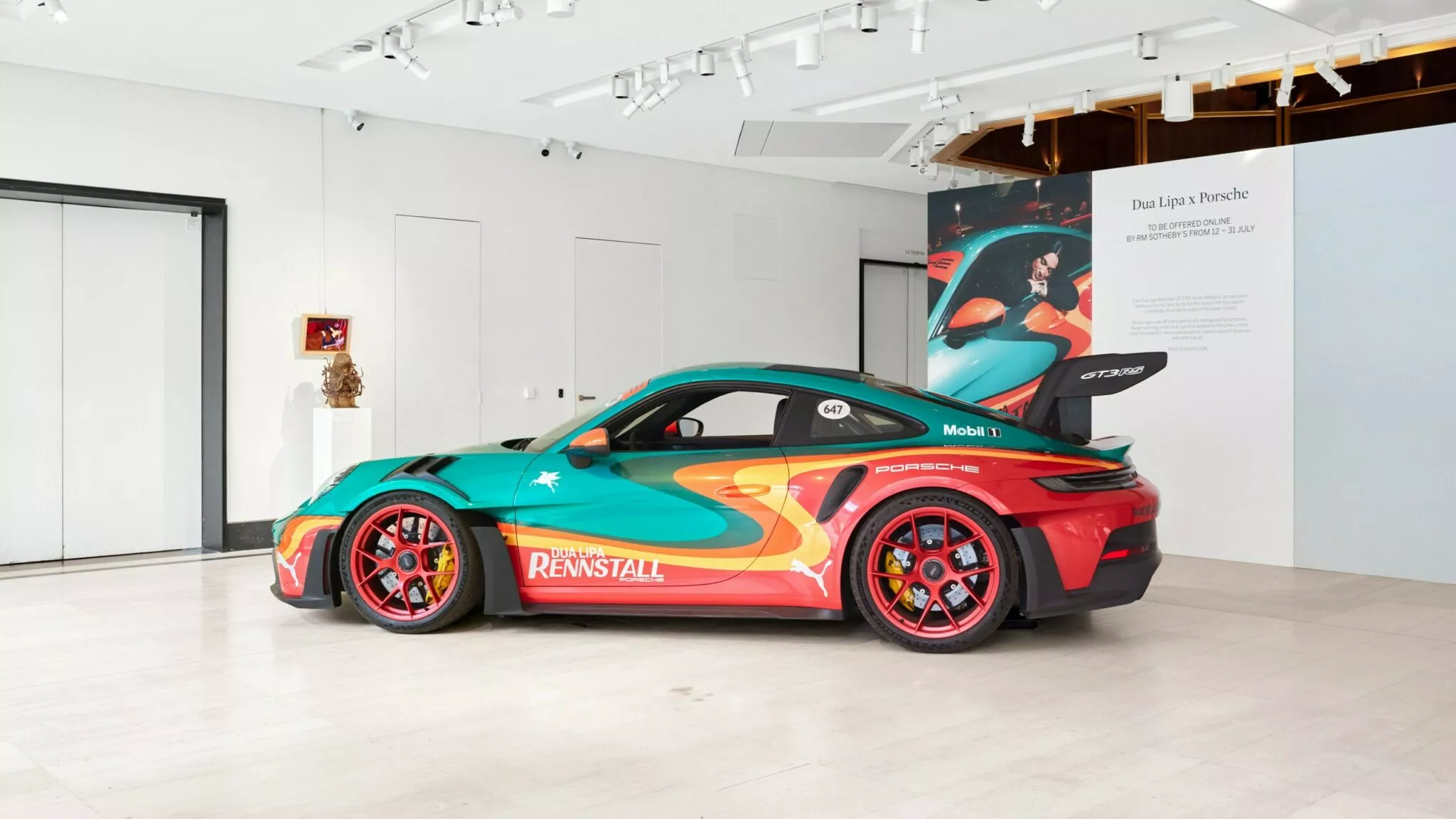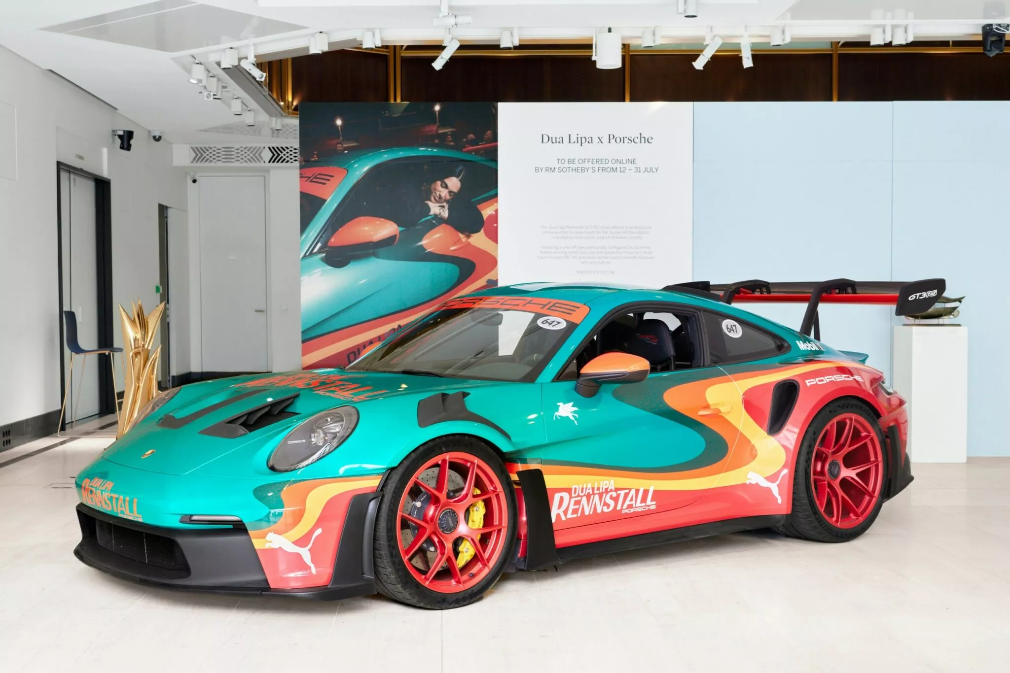 A cantora Dua Lipa colaborou com a Porsche na criação de um Porsche 911 GT3 RS exclusivo, destacando-se pela sua pintura vibrante em tons de turquesa, vermelho, laranja e verde. O design, inspirado nos clássicos carros de corrida da marca, contrasta com a cor original “Arctic Grey” do veículo.