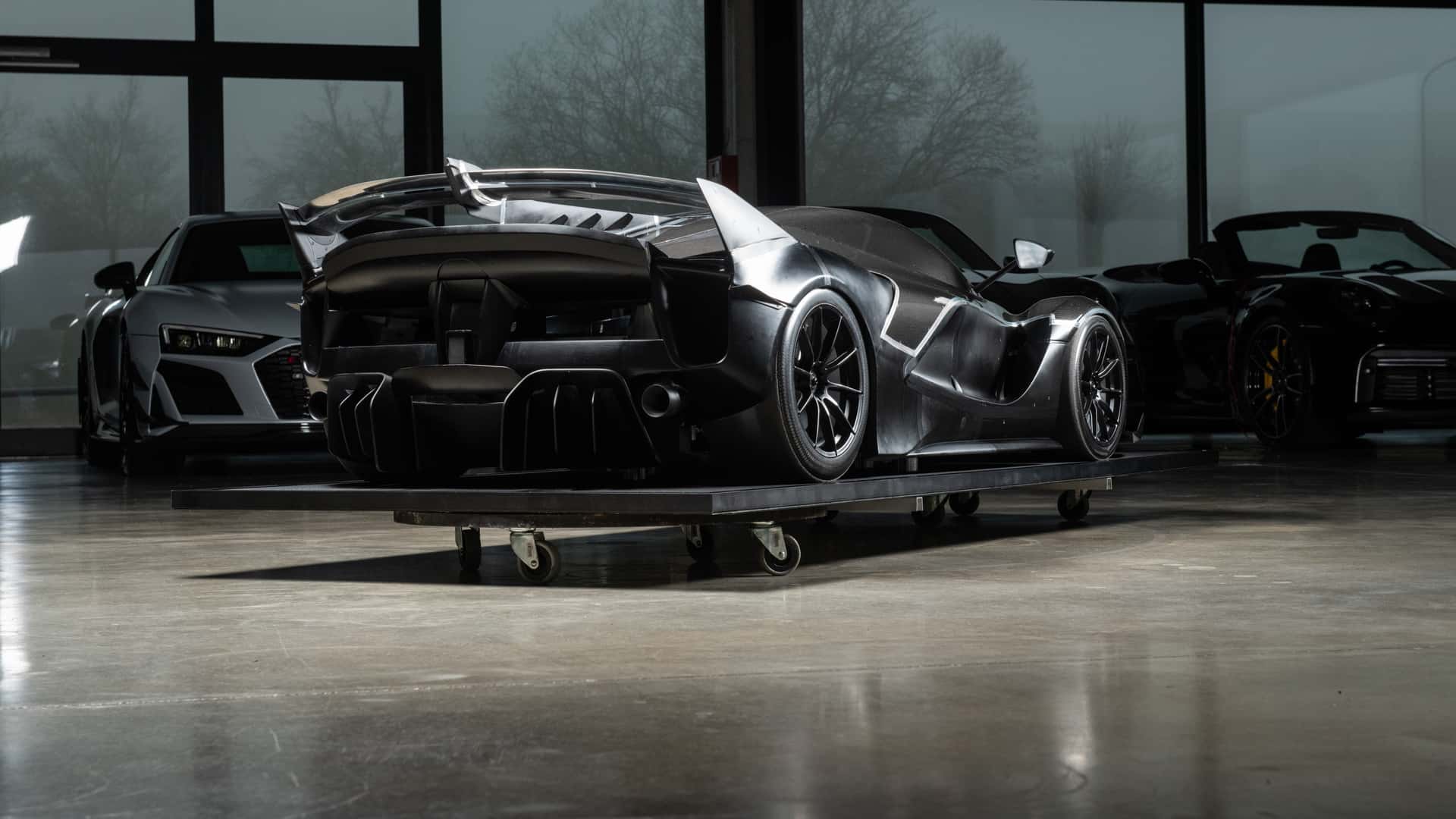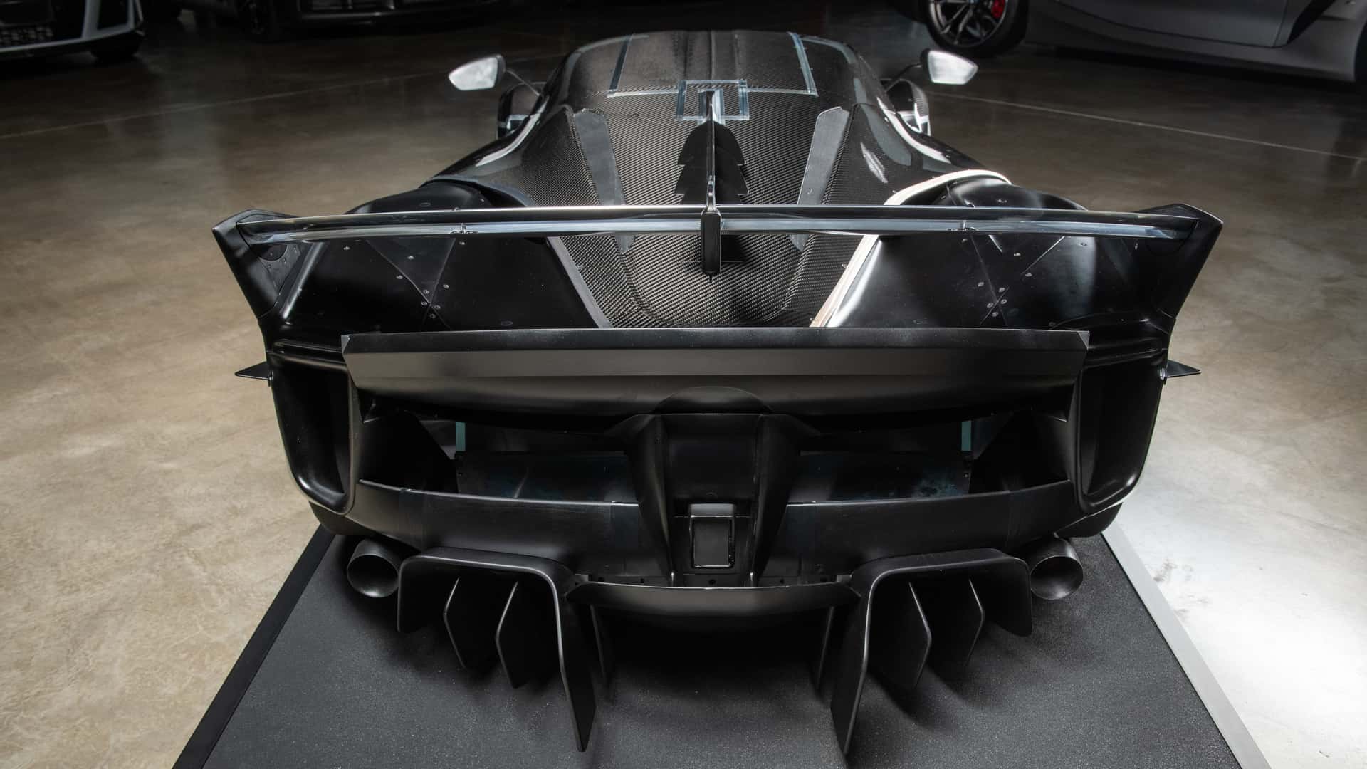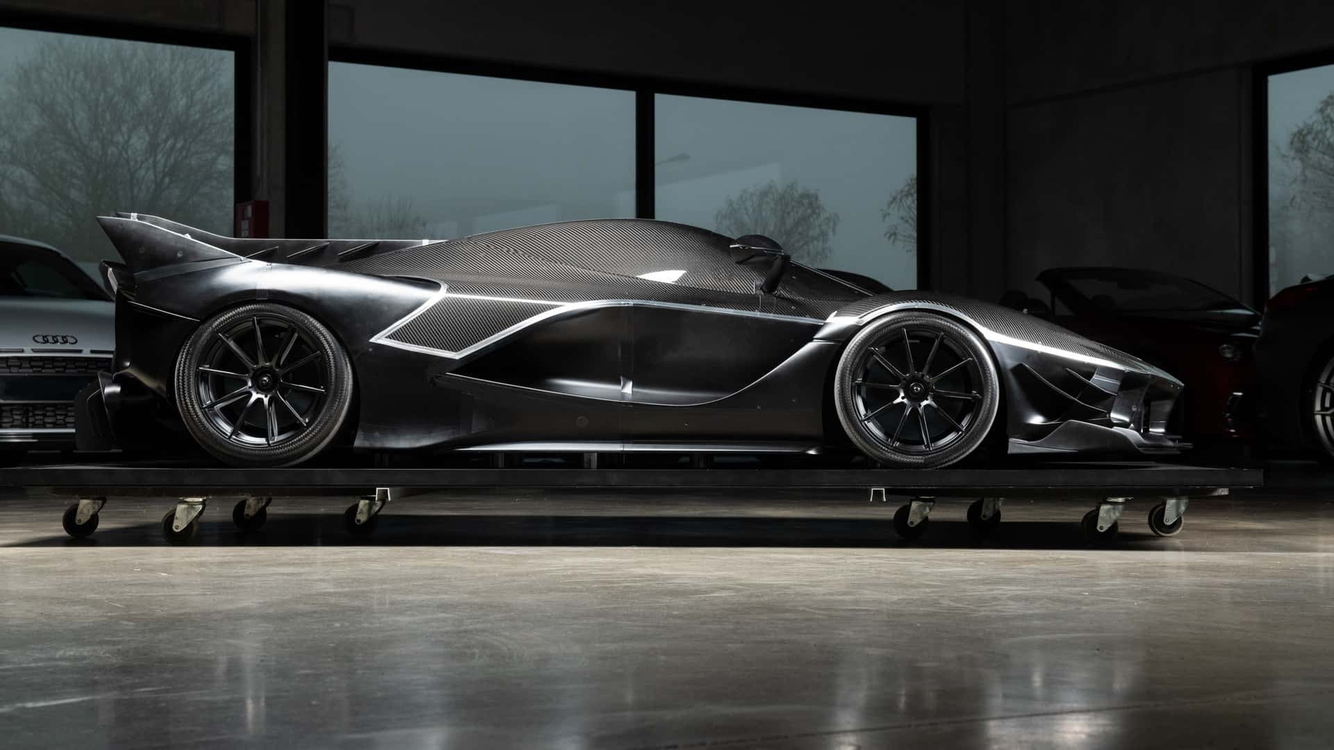 A carroçaria é parcialmente feita de fibra de carbono, mas não dispõe de portas, nem de janelas. A RM Sotheby’s sugere até expô-lo numa parede para que se possa, assim, desfrutar das suas linhas agressivas de uma perspectiva diferente.