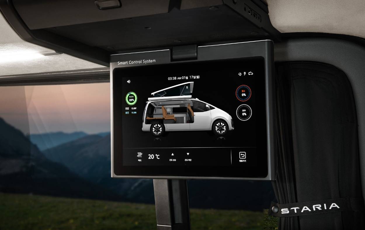 Para reforçar a privacidade, a segurança e o conforto geral durante a condução ou o descanso, o Staria Camper Concept explora a utilização de vidro inteligente com regulação eletrónica na zona traseira do habitáculo. Controlado por meio de um módulo touchscreen dedicado, este sistema permite ajustar instantaneamente a transparência e o nível de escurecimento, oferecendo simultaneamente um isolamento UV, térmico e acústico significativamente superior ao vidro convencional.