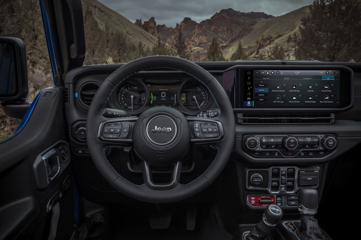 Por dentro, o Wrangler de 2024 conta com novas superfícies suaves ao toque, em tecido ou poliuretano, com pespontos de realce em cor contrastante. O sistema de infotainment Uconnect 5 – acessível num novo ecrã tátil de 12,3 polegadas – com sistema operativo Android é agora cinco vezes mais rápido e conta com atualizações over-the-air.