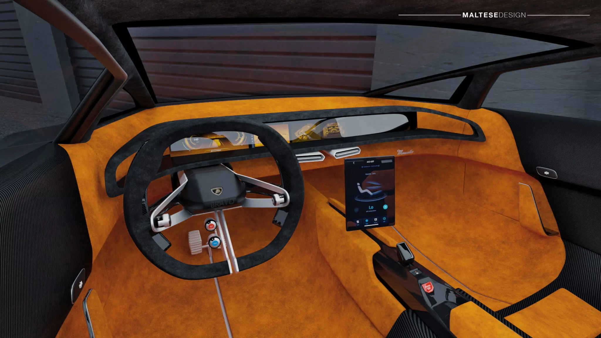 Agora, meio século à frente, o Bravo volta à vida moderna pelo lápis de Maltese, o designer que explica que pensou na monocoque em fibra de carbono do Aventador e no seu bestial V12, para dar movimento a esta escultura sobre rodas.