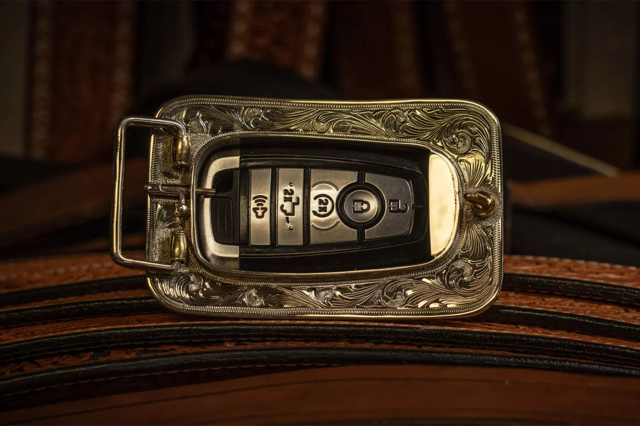 A ideia nasceu de uma colaboração com a oficina de ourivesaria “A Cut Above Buckles”, especializada em acessórios para o mundo do rodeio. Cada peça, feita à mão, ostenta uma gravura detalhada da frente de uma F-150 de 1975, o ano do lançamento do modelo.