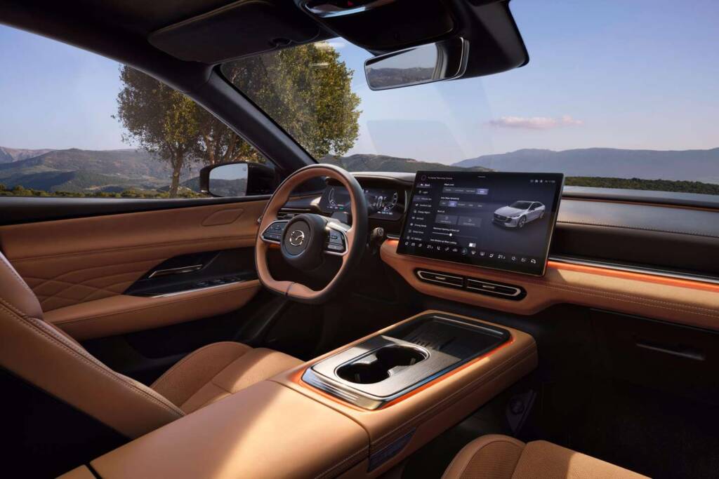 O habitáculo aposta num luxo discreto. Materiais tácteis (falso alcântara, metais escovados) e costuras contrastantes criam um ambiente premium. Os bancos dianteiros, com aquecimento/ventilação, são ergonómicos para longas distâncias, mas o espaço traseiro é apenas suficiente para adultos de estatura média. E também a tecnologia divide opiniões: o painel digital de 10.25″ e o ecrã central flutuante de 14″ oferecem gráficos nítidos, mas a obsessão pelo minimalismo eliminou botões físicos críticos (ex: controlo de climatização). O sistema de infotenimento, com ChatGPT integrado e assistente vocal, é poderoso mas exige curva de aprendizagem. Já o frunk (72 litros) e a mala (466 litros, menos profunda que a do antigo 6 a combustão) compensam na utilidade. Tudo somado, o 6e coloca-se como alternativa competitiva aos mainstream alemães, embora a verdadeira prova de fogo venha do lado de lá do Atlântico (Tesla). E o Mazda tem o que é preciso para responder à letra.