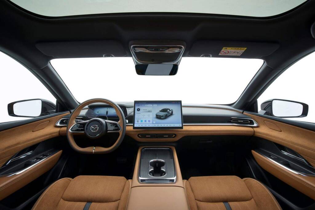 A base técnica é outro segredo desta reinvenção. Ao adaptar a arquitetura modular EPA-F do Deepal L07 (da Changan), a Mazda acelerou o desenvolvimento sem abdicar do seu know-how dinâmico. Dois conjuntos motopropulsores estarão disponíveis: a versão Standard, com motor traseiro de 258 CV (190 kW), bateria LFP de 68,8 kWh, autonomia WLTP combinada de 479 km (até 605 km urbano); e Long Range: 245 CV (180 kW), bateria NMC (níquel-manganês-cobalto de 80 kWh, 552 km WLTP (692 km urbano). Ambos partilham o mesmo binário (320 Nm) e priorizam eficiência, com consumos médios rondam os 16.5 kWh/100 km. No carregamento DC rápido, recupera 80% da bateria em 24 minutos (Standard) ou 47 minutos (Long Range), garantindo até 235 km adicionais em 15 minutos.