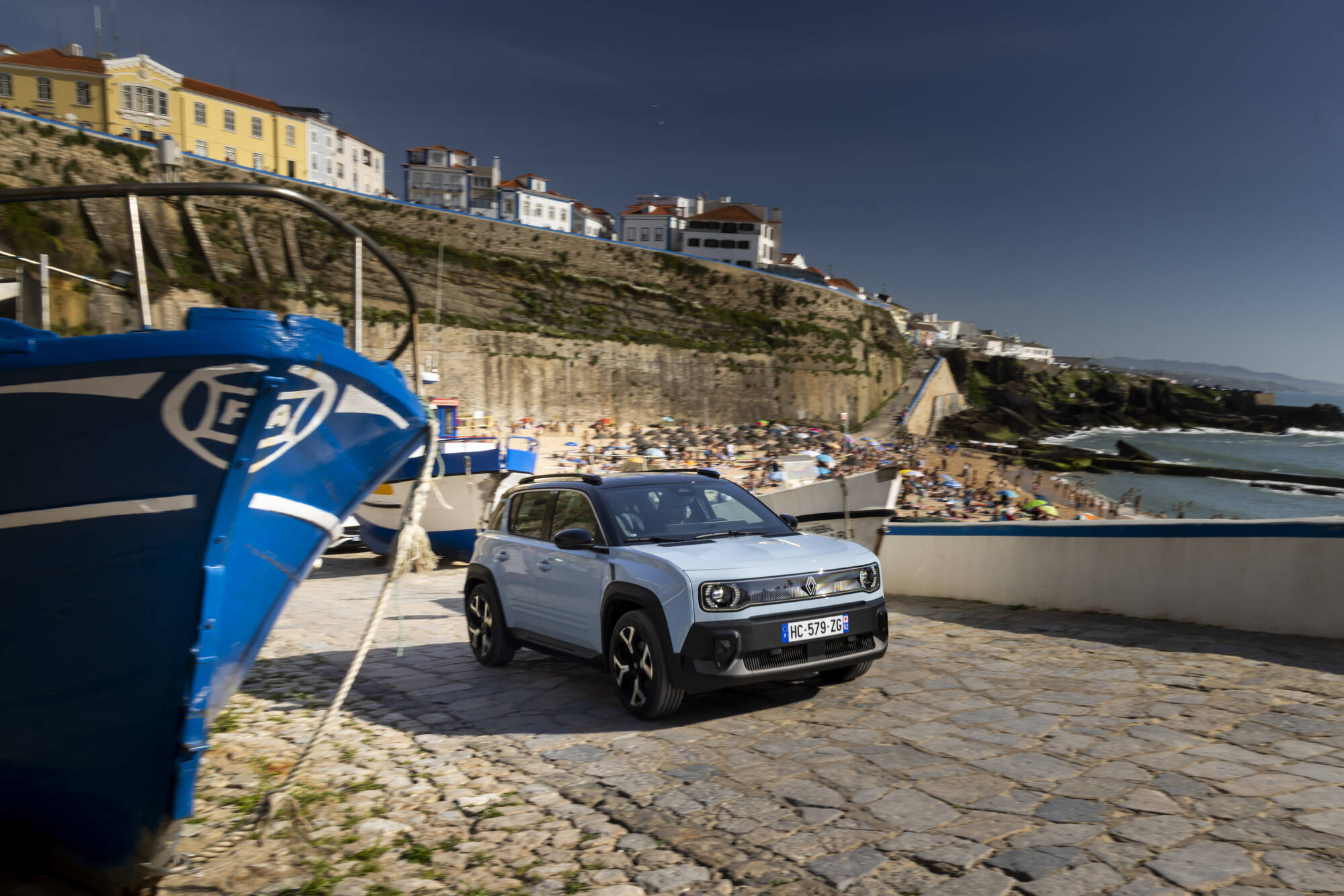 Ah, e não nos esqueçamos do design. As linhas retrofuturistas são uma carta de amor ao Renault 4 original — os faróis em cápsula, os para-choques com batentes que lembram os ganchos clássicos, até o óculo traseiro, que agora é puro cool factor. E as cores? Desde o Verde Hauts-de-France (que muda de tom conforme a luz) até ao Azul Nuage, que encontrámos nas unidades de teste que invadiram Lisboa e a região da Ericeira para o evento de apresentação dinâmica à imprensa internacional.