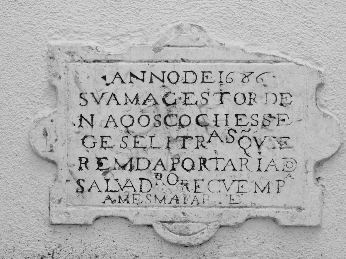Na placa que conta já com mais de 330 anos de idade, pode ler-se algo como “”Anno 1686. Sua Majestade ordena que os coches, seges e liteiras que vierem da portaria do Salvador, recuem para a mesma parte.”