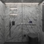 A casa de banho está localizada no centro e serve de divisória física entre o quarto principal e a área de estar principal. Está dividida em três divisões diferentes, cada uma com uma funcionalidade muito específica, pelo que encontrará o lavatório em plano aberto de um lado e a sala de duche e a casa de banho do outro. Os acessórios são novamente todos retro, com cinzentos escuros a servir de contraste.