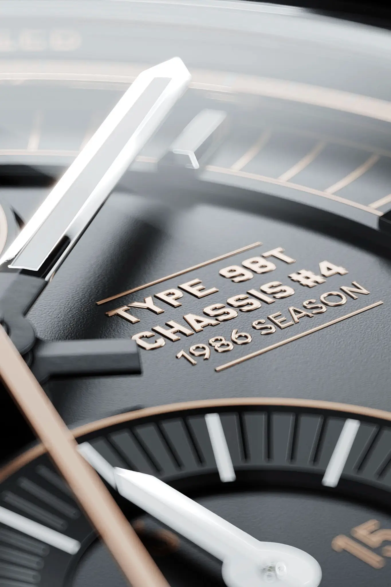 O relógio, tal como o monolugar, apresenta a mítica pintura preta e dourada JPS (John Player Special) e… não é barato.