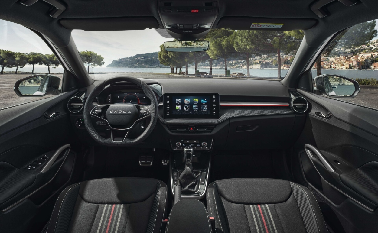 No interior, destaque para o volante desportivo multifunções de três raios, coberturas dos pedais em aço, que reforçam o caráter desportivo do Skoda Fabia 130. Nota ainda para soleiras das portas em alumínio preto, bem como para os elementos decorativos prateados no painel e nos puxadores das portas e bancos elétricos.