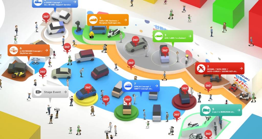 A página inicial apresenta uma planta 3D da área de exposição total da Suzuki, a qual serve como mapa para conhecer a localização das câmaras de 360° dos modelos expostos, bem como para iniciar o percurso imersivo através das muitas novidades apresentadas: veículos de turismo, motos, soluções de mobilidade pessoal, barcos e veículos voadores.