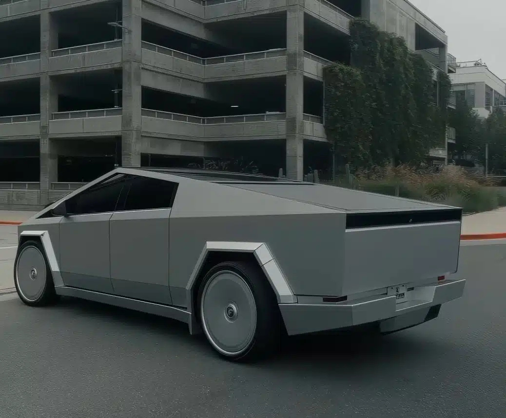 Também se pode notar que o veículo está muito mais baixo do que uma Cybertruck normal. A Tesla equipou a carrinha com uma suspensão pneumática adaptável. No entanto, isto pode parecer uma ilusão de ótica, uma vez que os para-choques pretos, os guarda-lamas e as saias laterais da carrinha já não são pretos e foram pintados para combinar com o resto da carroçaria.
