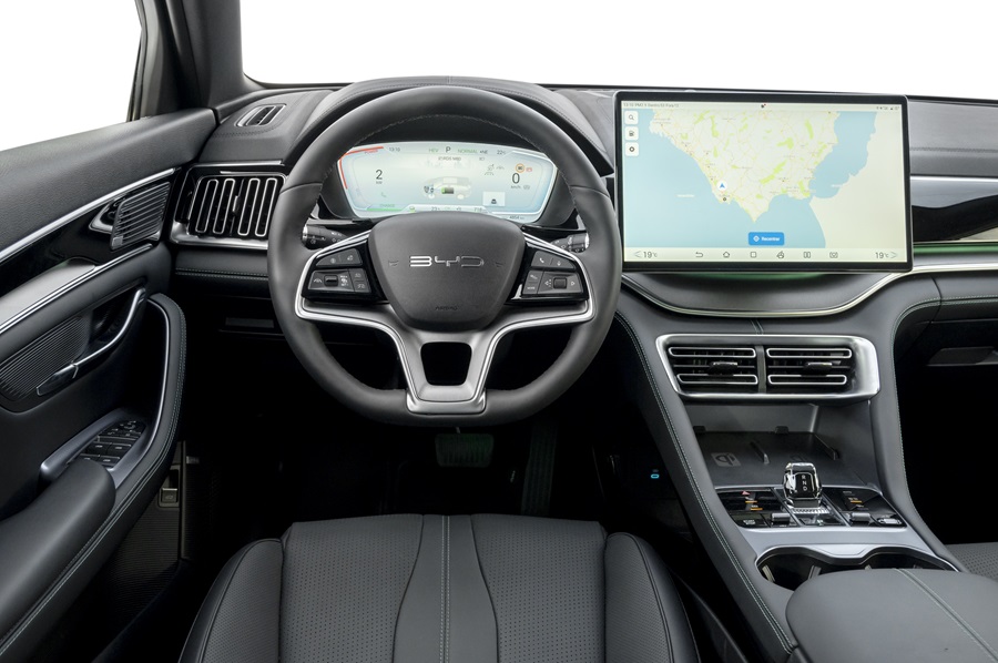 A combinação dos dois motores, combustão e elétrico não é das mais musculadas, mas em boa verdade, a BYD propõe versões com potências e autonomias diferentes neste mesmo PHEV. Assim, a nossa opção Boost (versão de entrada) é a mais comedida, contudo não deixa de ser uma escolha equilibrada e suficiente. Com tração dianteira, junta um propulsor a gasolina de quatro cilindros e 1.5 litros (97 CV) baseado no ciclo Atkison, sem turbo, a um motor elétrico, alimentado por uma bateria de 18,3 kWh, para anunciar uma potência total de 215 CV e um binário máximo de 300 Nm. Números mais do que suficientes para animarem um conjunto de quase duas toneladas: acelera de 0 a 100 km/h em 8,9 segundos e garante uma velocidade máxima de 170 km/h (limitada). A autonomia sem emissões anunciada de 80 quilómetros é a mais modesta (há uma versão com até 125 km), embora, como na maioria dos PHEV, não seja fácil de obter (ficámos pelos 70). Ainda assim, parece-nos suficiente para que na generalidade das rotinas no dia-a-dia se consiga aproveitar esta benesse sem estar sempre a pensar que o temos de ligar à corrente. Finda a energia, não se observa um aumento drástico dos consumos de combustível, como é tão comum neste tipo de híbridos.