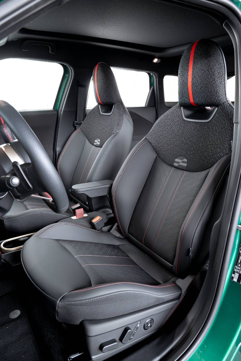Minimalista, o interior combina o lado nostálgico presente em detalhes como os interruptores para a ‘ignição’ (termo figurado, entenda-se) com a virtude moderna do ecrã central tátil de 9,4” (240 mm de diâmetro), cujo formato circular também remeta para o Mini original. Os retoques desportivos são em grande número, a começar pelos revestimentos em tecido no tablier, com apontamentos gráficos que se transformam no quadriculado da bandeira de xadrez, passando pelo volante desportivo em pele Vescin perfurada com botão “Boost” e terminando nos bancos desportivos aquecidos e de ajuste elétrico em misto de pele artificial Vescin e tecido com excelente suporte do corpo.