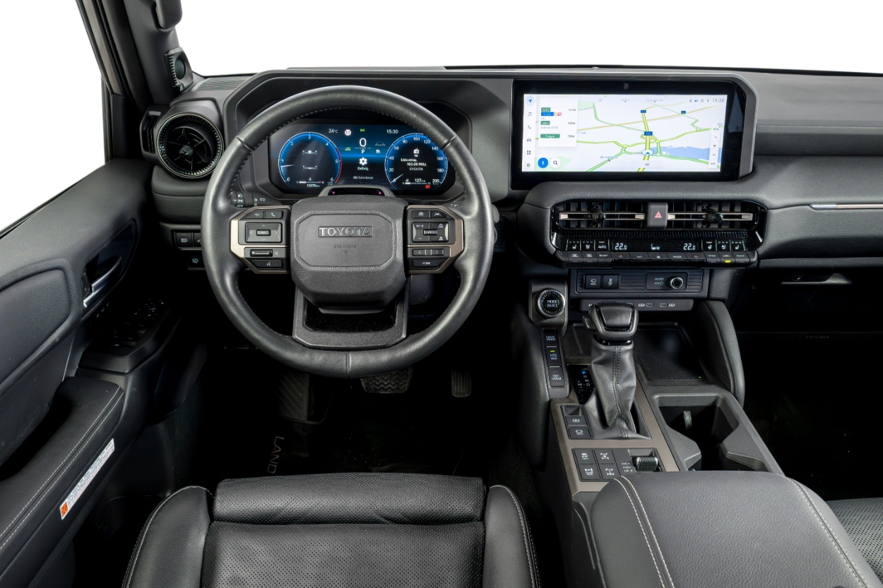 No habitáculo, o Land Cruiser equilibra modernidade e tradição. Os dois ecrãs — um para o condutor, outro para o sistema multimédia — coexistem harmoniosamente com comandos físicos, essenciais para quem precisa de operar o veículo em condições adversas. Foram desenvolvidos em colaboração com pilotos de rali para garantir reação imediata. Os materiais, embora não luxuosos, transmitem uma solidez quase indestrutível, com painéis bem encaixados e uma consola central que resiste a pressões e puxões sem um único rangido. Os bancos, redesenhados, oferecem melhor suporte em terrenos acidentados, e as superfícies almofadadas protegem joelhos e ombros em percursos mais duros.