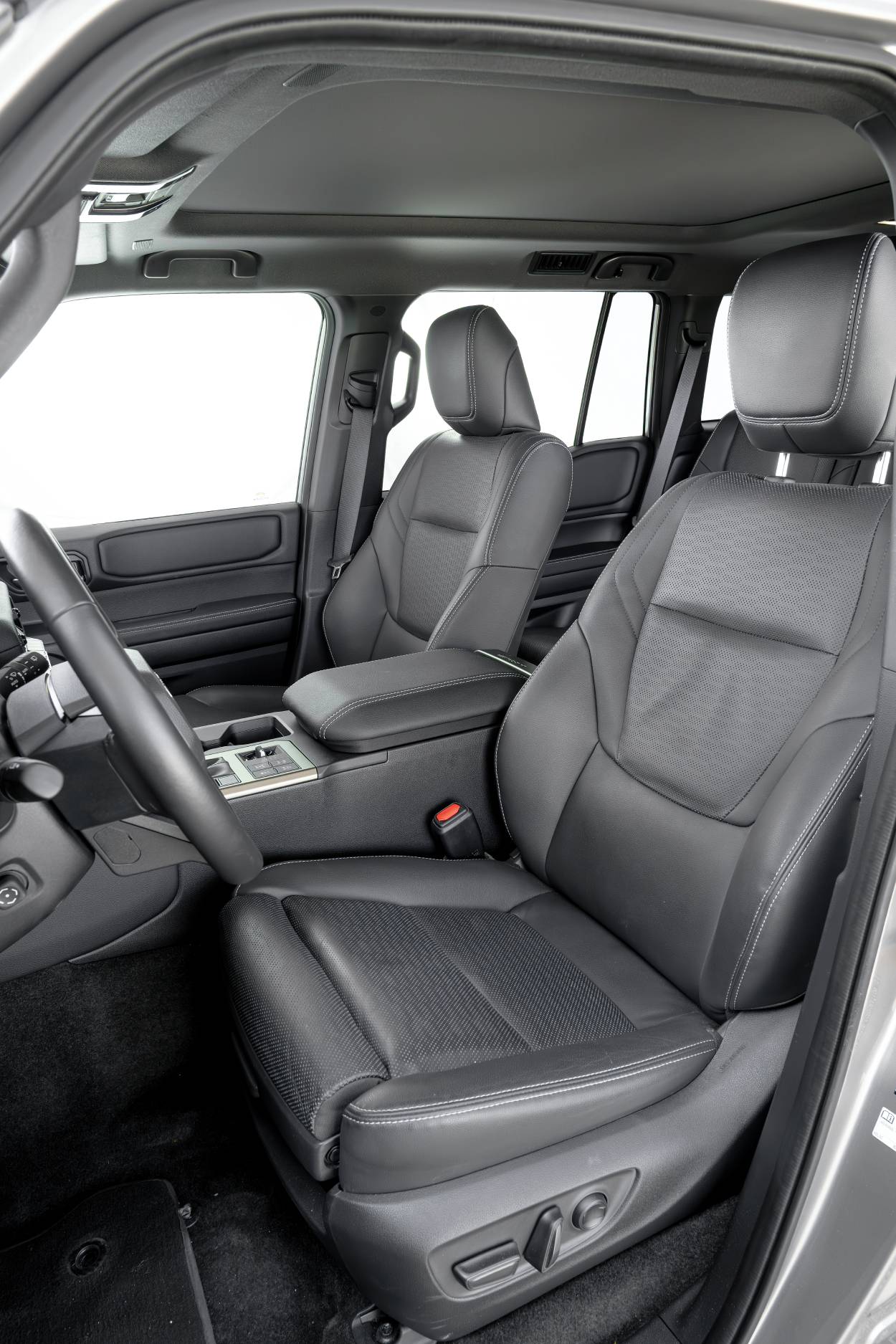A base é a nova plataforma GA-F, com uma estrutura reforçada que aumenta a rigidez em 50%. Pela primeira vez, o Land Cruiser adota direção elétrica, proporcionando maior precisão ao volante, além de permitir sistemas avançados como o Lane Tracing Assist, enquanto a suspensão, apesar de manter o esquema clássico de eixo rígido traseiro, oferece um conforto superior, absorvendo irregularidades com maior eficácia.