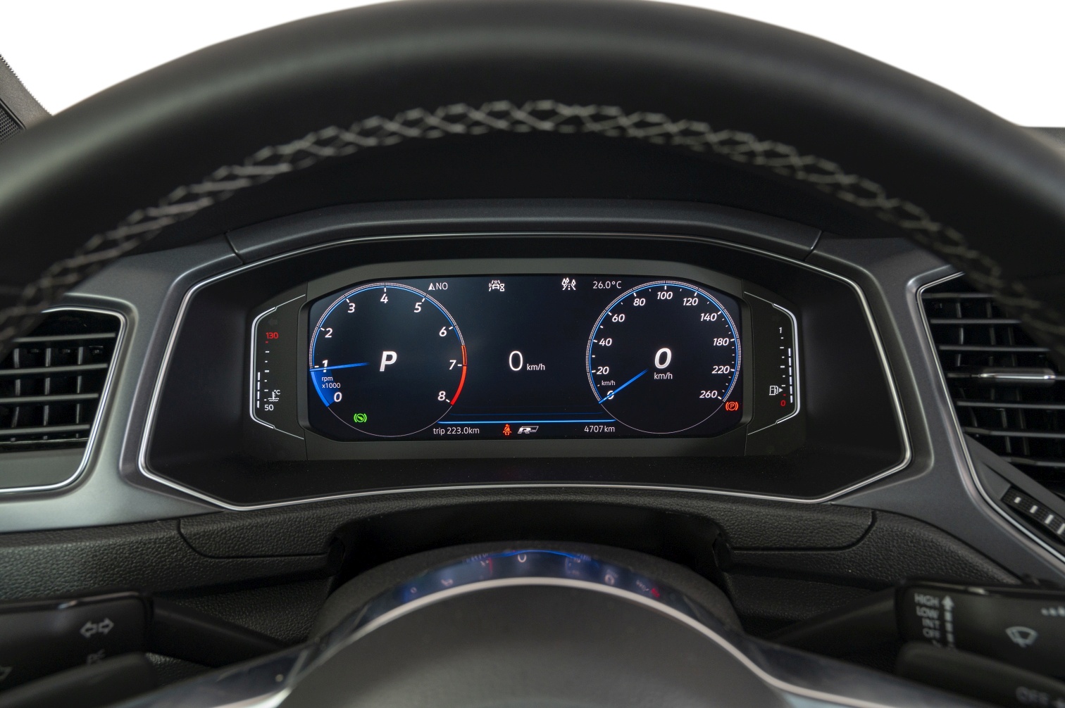 No habitáculo há menos novidades, principalmente quando olhamos a partir do posto de condução. A zona central do tablier está direcionada para o condutor, incluindo o ecrã de entretenimento perfeitamente integrado no tablier. O ambiente a bordo, apesar do aspeto moderno e jovem, é penalizado pela utilização de plásticos duros que acabam por prejudicar a qualidade final percebida. Referir ainda que, nesta versão R-Line, a instrumentação é digital a partir de um ecrã de 10,2″.