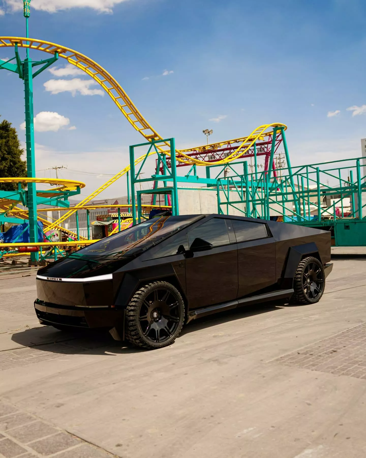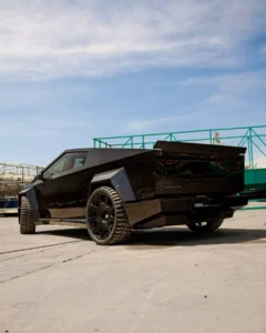 A Billion revestiu os painéis de aço inoxidável com um revestimento preto brilhante que – para nossa surpresa – combina muito bem com o Cybertruck. Em seguida, aparafusou um conjunto de arcos alargados e, embora a empresa não tenha mencionado as dimensões, eles certamente parecem mais largos do que o kit widebody construído pela Waido.