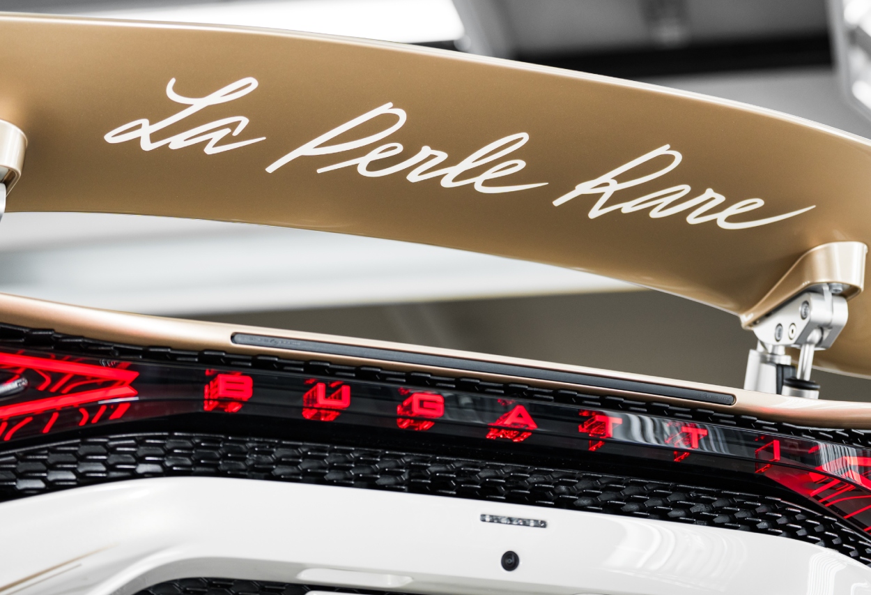 Como é habitual nas encomendas Sur Mesure, os detalhes contam a verdadeira história. O icónico motivo do “Elefante Dançante”, originalmente esculpido por Rembrandt Bugatti e estreado no Type 41 Royale, surge bordado nos encostos dos bancos, nas soleiras das portas e no painel transparente do seletor da caixa de velocidades. Já a inscrição “La Perle Rare” aparece no túnel central, na tampa do motor e até na parte inferior da asa traseira.