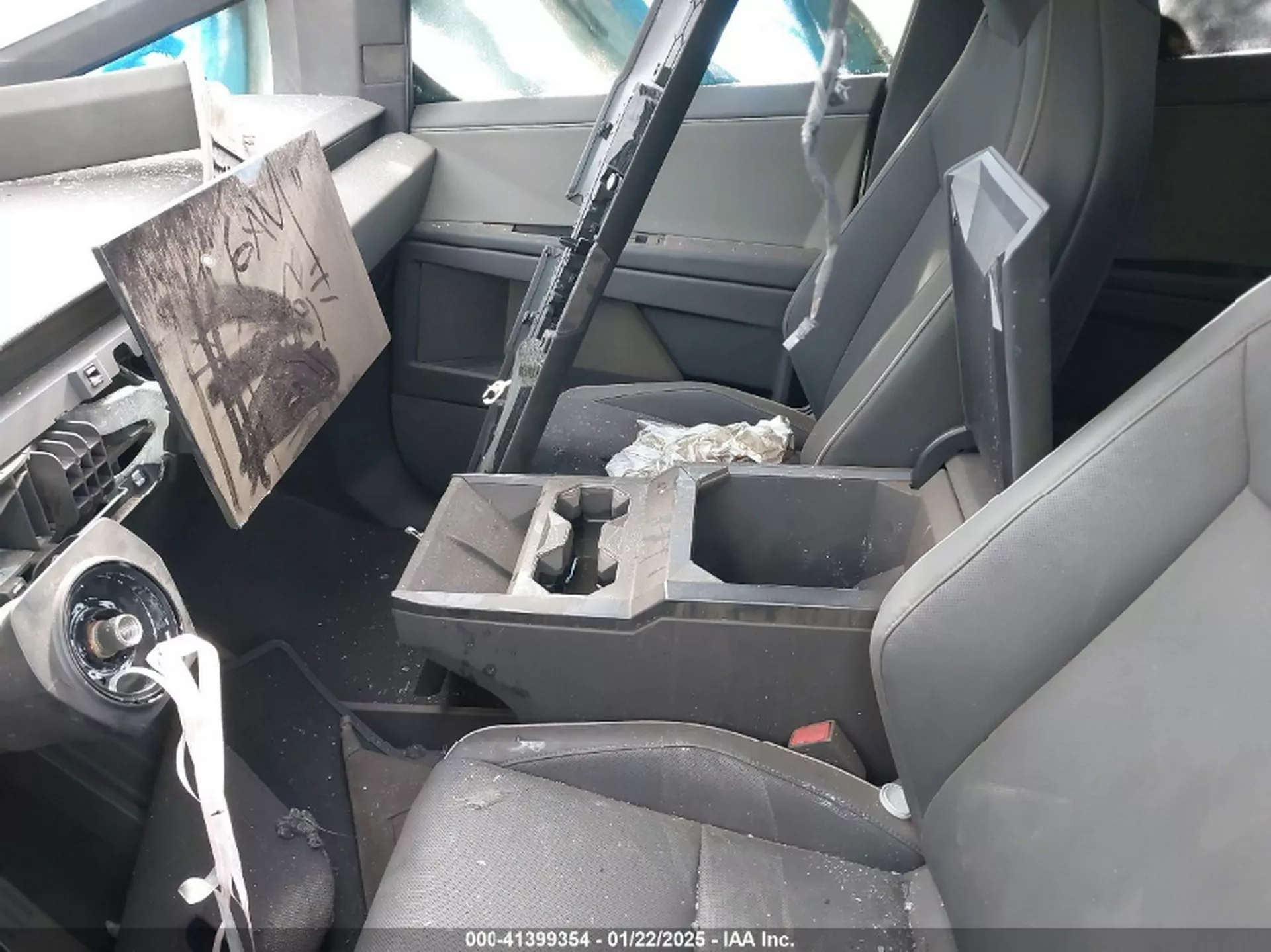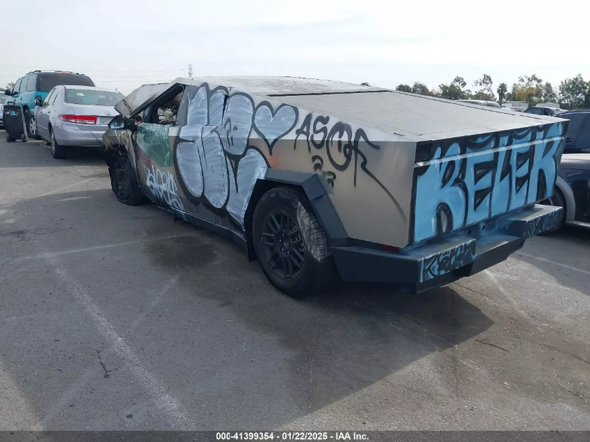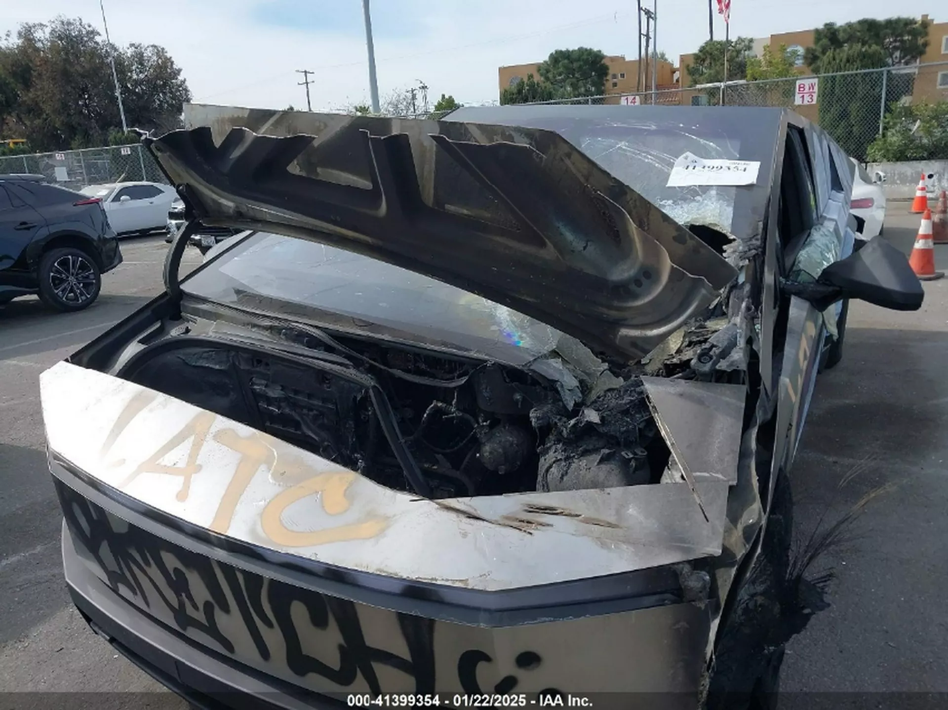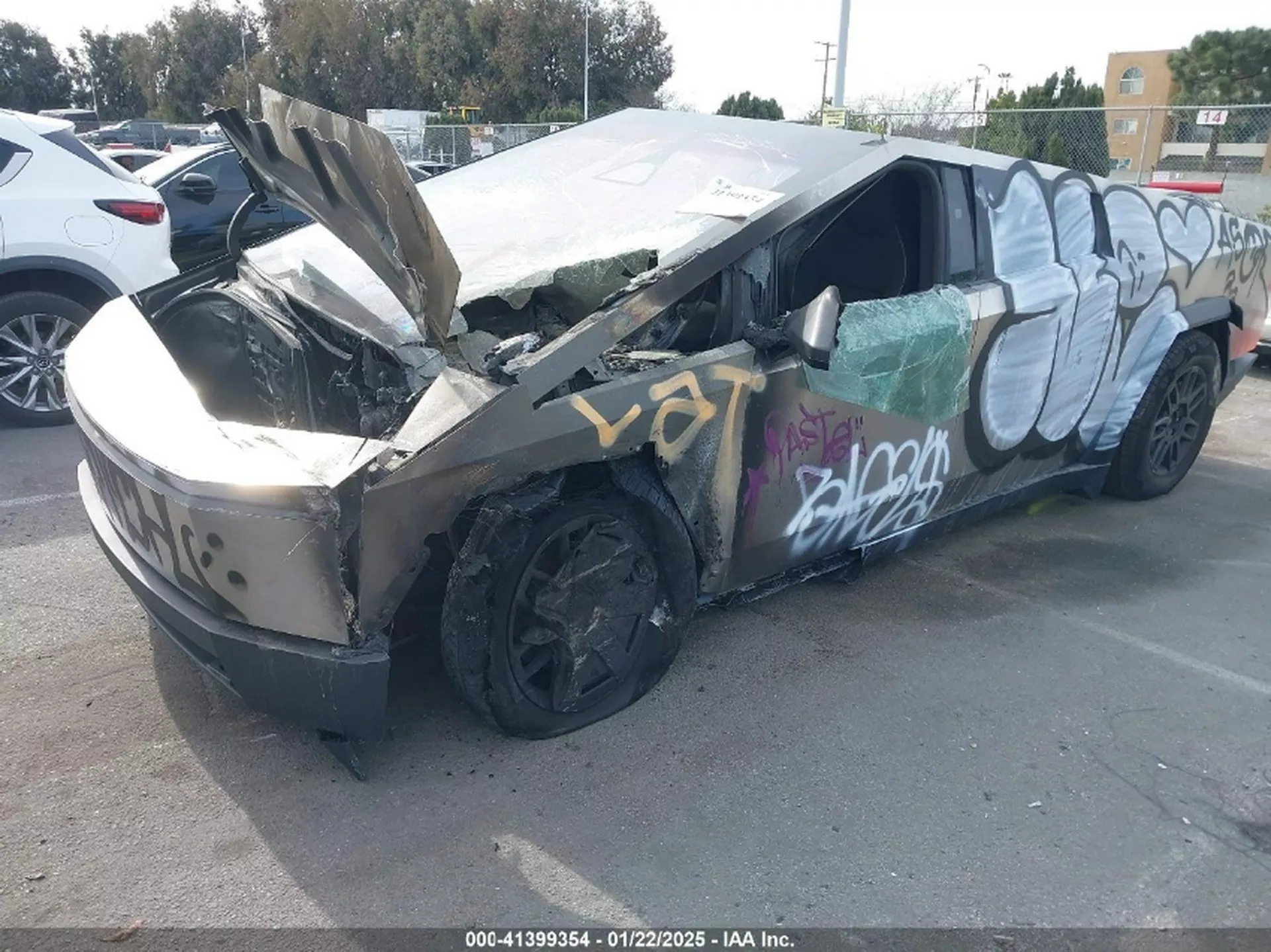 O veículo, que sofreu um ato de vandalismo em janeiro passado num parque de estacionamento de Los Angeles, apresenta queimas no interior, vidros partidos, pneus carbonizados e a carroçaria coberta de graffiti. O volante, o painel de instrumentos e o sistema de infotainment desapareceram, restando apenas os bancos traseiros em condições relativamente preservadas.