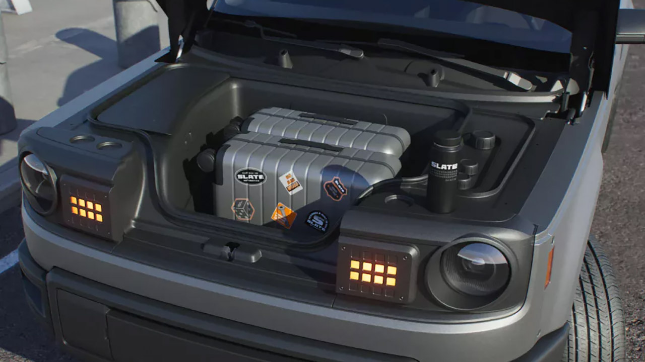Equipado com uma bateria de 52,7 kWh (alvo de 240 km), o Slate Truck é perfeito para deslocações diárias. Uma opção extra de 84,3 kWh estende a autonomia para 386 km. Carregamento rápido (120 kW) permite 80% da bateria em menos de 30 minutos, ou pode carregar em casa durante a noite.